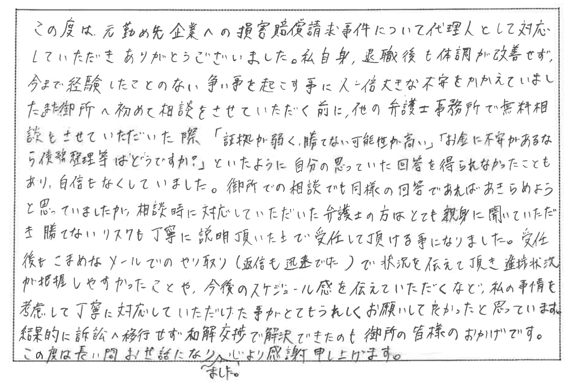 この度は元勤め先企業への損害賠償請求事件について代理人として 対応していただきありがとうございました。 私自身、退職後も体調が改善せず、今まで経験したことのない争い事を起こすことに人一倍大きな不安を抱えていました。また。御事務所へ 初めて相談させていただく前に、他の弁護士事務所で無料相談をさせていただいた際「 証拠が弱くて勝てない可能性が高い」 お金に不安があるなら、債務整理等はどうですか?」といったように、 自分の思っていた回答を得られなかったこともあり自信をなくしていました。